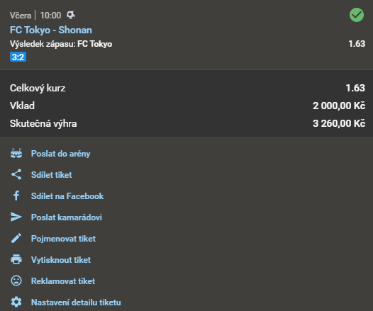 DOPOLEDNÍ SUPERLEVNÝ TIP! = DOPORUČUJEME PRO KLIENTY S RAZANTNĚ NIŽŠÍM KAPITÁLEM! = DLE NAŠEHO NÁZORU MÍRNĚ ZVÝŠENÉ RIZIKO! = 92.3% DŮVĚRA! 1.64 17. 3. 2021 10:00 FC Tokyo - Shonan TIP: 1 Zobrazit OK Zobrazit + 1 640 Kč
