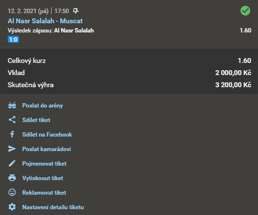 VEČERNÍ SUPERLEVNÝ FOTBALOVÝ TIP S DŮVĚROU 89%! = IDEÁLNÍ PRO KLIENTY, KTEŘÍ SI TIPY S VYŠŠÍ DŮVĚROU NEMOHOU DOVOLIT! 1.66 12. 2. 2021 17:50 Al Nasr Salalah - Muscat TIP: 1 Zobrazit OK Zobrazit + 1 660 Kč