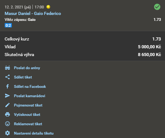 NAPROSTO EXKLUZIVNÍ PREMIUM EXCLUSIVE TIP S EXTRÉMNĚ VYSOKOU DŮVĚROU (99.3%) A VELMI DŮRAZNÝM DOPORUČENÍM! = IDEÁLNĚ DOPORUČUJEME VSADIT ZA ZVÝŠENÝ VKLAD! = MEGA DOPORUČUJEME!!! 1.84 12. 2. 2021 17:30 Tenis, Masur - Gaio TIP: Gaio Zobrazit OK Zobrazit + 1 840 Kč