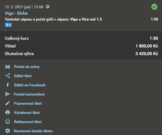 Fotbal, Celta Vigo - Elche 1.85 12. 2. 2021 21:00 Domácí a více než 1,5 gólu Zobrazit OK Zobrazit + 1 850 Kč