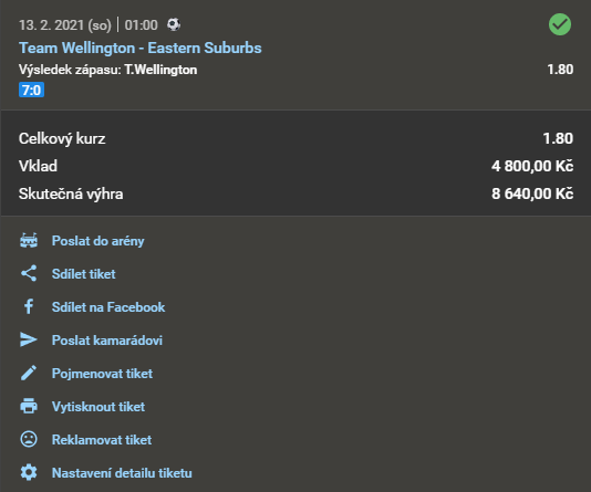 NOČNÍ MEGA TIP #1 = ABSOLUTNÍ POVINNOST VSADIT! = DOPORUČUJEME VSADIT ZA ZVÝŠENÝ VKLAD! = DŮVĚRA 98.7%! = SUPERTIP! 1.81 12. 2. 2021 23:59 Team Wellington - Eastern Suburbs TIP: 1 Zobrazit OK Zobrazit + 1 810 Kč