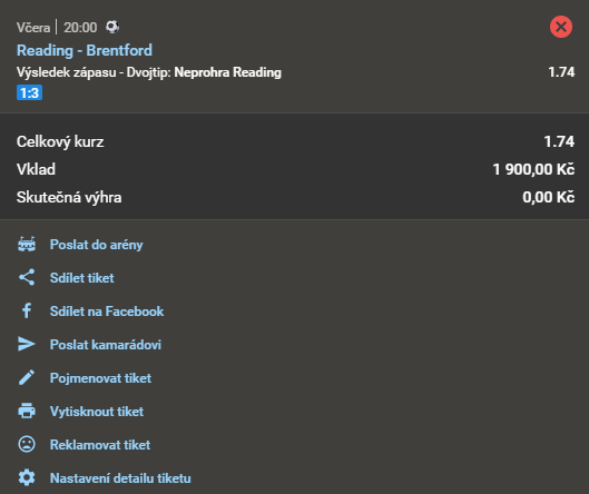 Fotbal, Reading - Brentford 1.72 10. 2. 2021 20:00 Neprohra domácí Zobrazit KO Zobrazit 0 Kč
