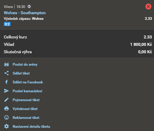 Fotbal, Wolves - Southampton 2.33 11. 2. 2021 18:30 Domácí Zobrazit KO Zobrazit 0 Kč
