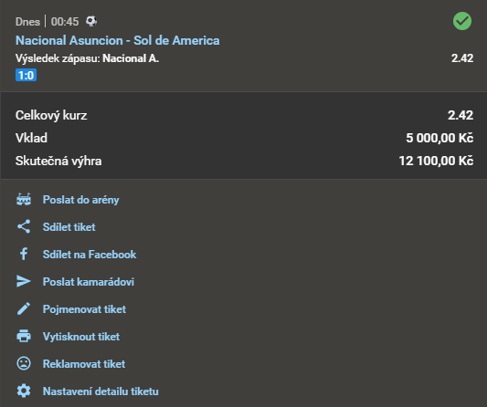 NOČNÍ MEGA TIP #2 = EXTRÉMNĚ VYSOKÁ DŮVĚRA (99.9%)- NEJVYŠŠÍ DŮVĚRA U NOČNÍHO MEGA TIPU + NAVÍC SE SLUŠNÝM KURZEM! = EXTRÉMNĚ DOPORUČUJEME! = DLE NAŠEHO NÁZORU POVINNOST! 2.42 9. 2. 2021 23:59 Nacional Asuncion - Sol de America TIP: 1 Zobrazit OK Zobrazit + 2 420 Kč