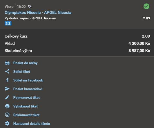 PREMIUM EXCLUSIVE TIP = DLE NAŠEHO NÁZORU ABSOLUTNÍ POVINNOST VSADIT! DOPORUČUJEME! (98.6% DŮVĚRA)! 2.05 10. 2. 2021 16:00 Fotbal, Ol. Nicosia - APOEL TIP: 2 Zobrazit OK Zobrazit + 2 050 Kč