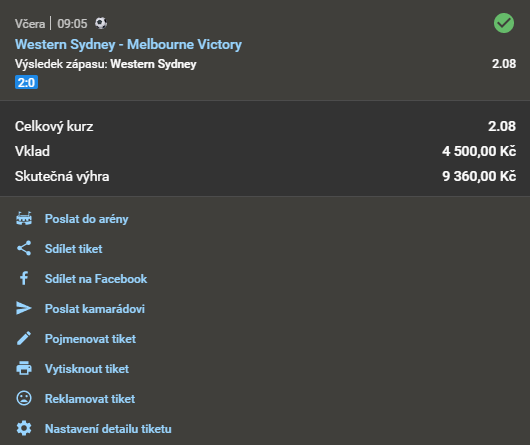 RANNÍ NAPROSTO EXKLUZIVNÍ MEGA TUTOVKA! = DLE NAŠEHO NÁZORU ABSOLUTNÍ POVINNOST VSADIT! = EXTRÉMNĚ DOPORUČUJEME! => DŮVĚRA 98.6%!! 2.08 10. 2. 2021 09:00 Western Sydney - Melbourne Victory TIP: 1 Zobrazit OK Zobrazit + 2 080 Kč