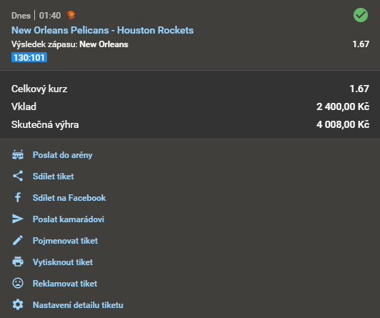 NOČNÍ MEGA TIP #3 = SUPERLEVNÝ NOČNÍ MEGA TIP! = IDEÁLNÍ PRO ZAČÁTEČNÍKY S NÍZKÝM KAPITÁLEM! 1.71 9. 2. 2021 23:59 New Orleans Pelicans - Houston Rockets TIP: 1 Zobrazit OK Zobrazit + 1 710 Kč