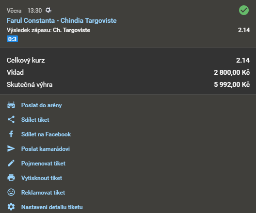 ODPOLEDNÍ SUPERTIP! = 96% DŮVĚRA! 2.15 10. 2. 2021 13:30 Farul Constanta - Chindia Targoviste TIP: 2 Zobrazit OK Zobrazit + 2 150 Kč