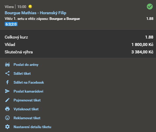 Tenis, Bourgue - Horanský 1.88 10. 2. 2021 17:00 Vítěz 1. setu a vítěz zápasu: Bourgue Zobrazit OK Zobrazit + 1 880 Kč