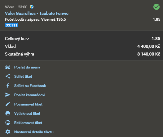 POZDNÍ VEČERNÍ TIP! = DŮVĚRA 98.3% = DLE NAŠEHO NÁZORU ABSOLUTNÍ POVINNOST VSADIT! => FÉROVÁ CENA! 1.86 9. 2. 2021 23:00 Volei Guarulhos - Taubate Funvic TIP: Počet bodů v zápasu => Více než 136.5 Zobrazit OK Zobrazit + 1 860 Kč