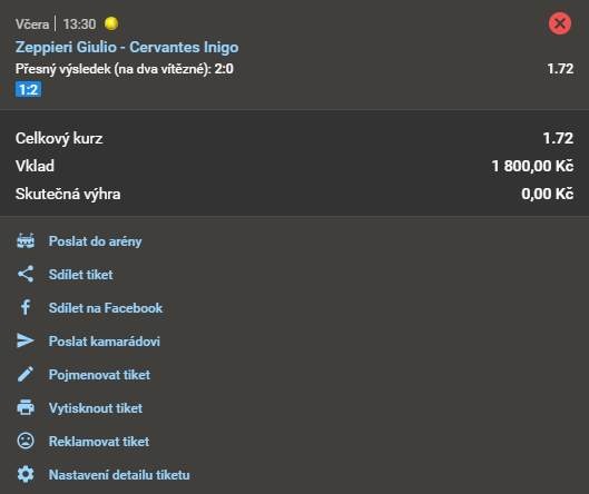 Tenis, Zeppieri - Cervantes 1.78 7. 2. 2021 15:00 Přesný výsledek (na dva vítězné): 2:0 Zobrazit KO Zobrazit 0 Kč