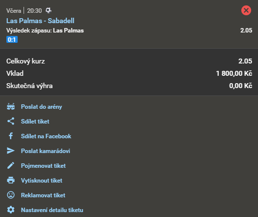 Fotbal, Las Palmas - Sabadell 2.08 7. 2. 2021 20:30 Domácí a více než 1,5 gólu Zobrazit KO Zobrazit 0 Kč
