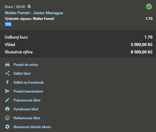 NOČNÍ MEGA TIP #2 = NAPROSTO EXKLUZIVNÍ NOČNÍ MEGA TIP S VELICE VYSOKOU DŮVĚROU (99.2%) = MEGA DOPORUČUJEME! 1.70 3. 2. 2021 23:59 Walter Ferreti - Junior Managua TIP: 1 Zobrazit OK Zobrazit + 1 700 Kč