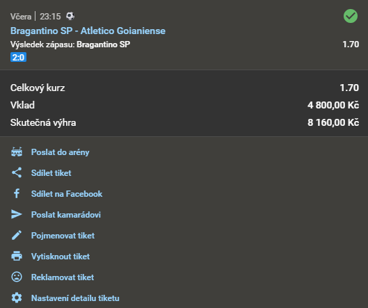 POZDNÍ VEČERNÍ TENISOVÝ TIP! = DŮVĚRA 98.3% = DLE NAŠEHO NÁZORU ABSOLUTNÍ POVINNOST VSADIT! 1.77 3. 2. 2021 23:15 Bragantino SP - Atletico Goianiense TIP: 1 Zobrazit OK Zobrazit + 1 770 Kč