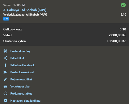 ODPOLEDNÍ MEGA KURZ! = MÍRNĚ RIZIKOVEJŠÍ SÁZKA S MEGA VYSOKÝM KURZEM = S POTENCIÁLEM VYSOKÉHO ZHODNOCENÍ! = DOPORUČUJEME PRO TY, KTEŘÍ SE NEBOJÍ RISKOVAT! (5.0+ KURZ)! 5.11 1. 2. 2021 17:00 Al Salmiya - Al Shabab (KUV) TIP: 2 Zobrazit OK Zobrazit + 5 110 Kč