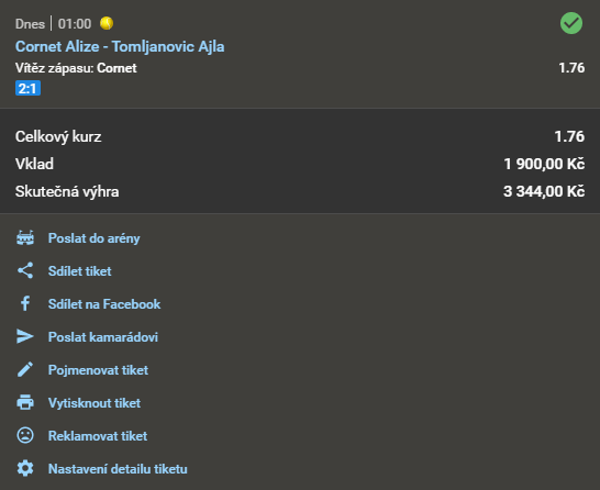 Tenis, Cornet - Tomljanovic 1.81 31. 1. 2021 23:59 Cornet Zobrazit OK Zobrazit + 1 810 Kč