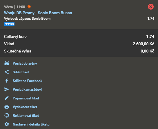 DOPOLEDNÍ SUPERLEVNÝ TIP! = IDEÁLNÍ PRO KLIENTY S MALÝM KAPITÁLEM! = DLE NAŠEHO NÁZORU ZVÝŠENÁ MÍRA RIZIKA -> Opatrně! 1.74 1. 2. 2021 11:00 Wonju DB Promy - Sonic Boom Busan TIP: 2 Zobrazit KO Zobrazit 0 Kč