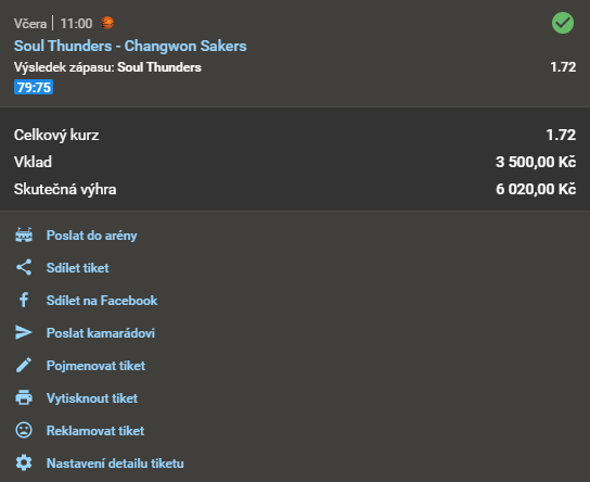 DOPOLEDNÍ SUPERTIP! = SKVĚLÝ POMĚR CENA / DŮVĚRA! (97% DŮVĚRA) = DOPORUČUJEME PRO KAŽDÉHO! 1.77 29. 1. 2021 11:00 Soul Thunders - Changwon Sakers TIP: 1 Zobrazit OK Zobrazit + 1 770 Kč