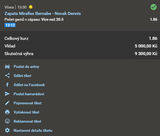 PREMIUM EXCLUSIVE TIP S VELICE VYSOKOU DŮVĚROU A NAŠÍM DOPORUČENÍM! = 98.5% DŮVĚRA! = Dle našeho názoru téměř výhra zdarma! = ABSOLUTNÍ POVINNOST VSADIT!! 1.86 14. 5. 2021 13:30 Tenis, Zapata Miralles - Novak TIP: Počet gamů v zápasu: Více než 20,5 Zobrazit OK Zobrazit + 1 860 Kč