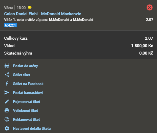 Tenis, Galan - McDonald 2.07 14. 5. 2021 15:00 Vítěz 1. setu a vítěz zápasu: McDonald Zobrazit KO Zobrazit 0 Kč