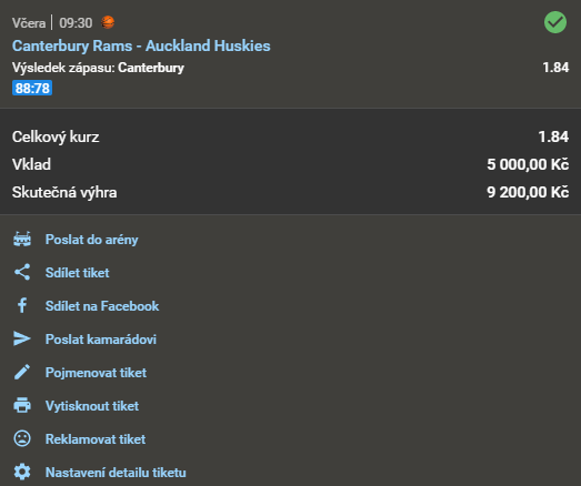 RANNÍ NAPROSTO EXKLUZIVNÍ MEGA "TUTOVKA"! = DLE NAŠEHO NÁZORU ABSOLUTNÍ POVINNOST VSADIT! = EXTRÉMNĚ DOPORUČUJEME! => DŮVĚRA 98.5%! 1.84 14. 5. 2021 09:30 Canterbury Rams - Auckland Huskies TIP: 1 Zobrazit OK Zobrazit + 1 840 Kč