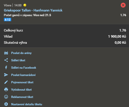 Tenis, Griekspoor T. - Hanfmann 1.78 11. 5. 2021 14:00 Počet gamů v zápasu: Více než 21,5 Zobrazit KO Zobrazit 0 Kč