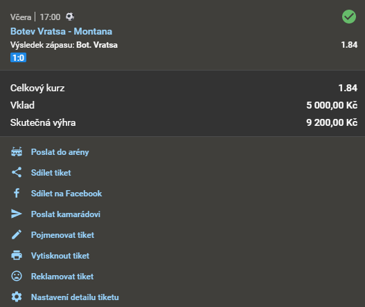ABSOLUTNÍ MEGA "TUTOVKA"! = DLE NAŠEHO NÁZORU ABSOLUTNÍ POVINNOST VSADIT! = MEGA DOPORUČUJEME (DŮVĚRA 98.8%)! 1.77 10. 5. 2021 17:00 Botev Vratsa - Montana TIP: 1 Zobrazit OK Zobrazit + 1 770 Kč