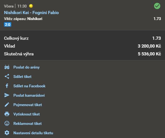 DOPOLEDNÍ SUPERTIP! = SKVĚLÝ POMĚR CENA / DŮVĚRA (97.3%)! = ZLATÁ STŘEDNÍ CESTA! ! = DOPORUČUJEME PRO KAŽDÉHO!! 1.73 10. 5. 2021 11:30 Nishikori Kei - Fognini Fabio TIP: 1 Zobrazit OK Zobrazit + 1 730 Kč