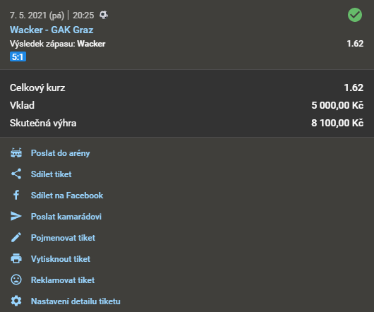 VEČERNÍ NAPROSTO EXKLUZIVNÍ PREMIUM TIP S EXTRÉMNĚ VYSOKOU DŮVĚROU PREMIUM TIPU! (99.79%) = EXTRÉMNĚ DOPORUČUJEME! = NAPROSTÁ POVINNOST VSADIT! = DNES DRUHÁ NEJVYŠŠÍ DŮVĚRA PREMIUM TIPU!! 1.62 7. 5. 2021 20:25 Wacker - GAK Graz TIP: 1 Zobrazit OK Zobrazit + 1 620 Kč