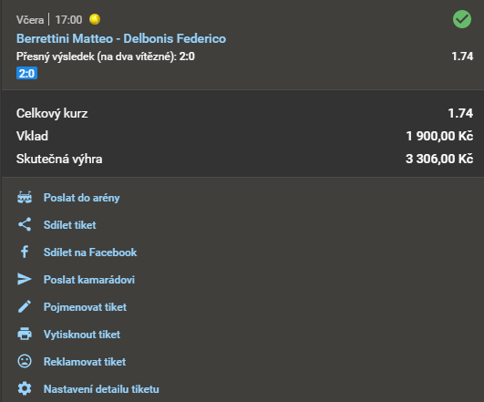 Tenis, Berrettini - Delbonis 1.77 6. 5. 2021 17:30 Přesný výsledek (na dva vítězné): 2:0 Zobrazit OK Zobrazit + 1 770 Kč