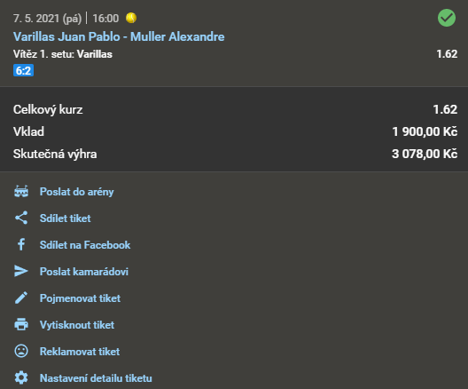 Tenis, Varillas - Muller 1.70 7. 5. 2021 16:00 Vítěz 1. setu: Varillas Zobrazit OK Zobrazit + 1 700 Kč
