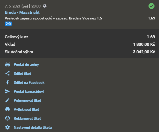 Fotbal, Breda - Maastricht 1.80 7. 5. 2021 20:00 Domácí a více než 1,5 gólu Zobrazit OK Zobrazit + 1 800 Kč