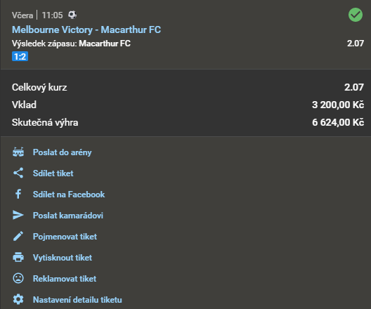 DOPOLEDNÍ SUPERTIP! = SKVĚLÝ POMĚR CENA / DŮVĚRA (97.3%)! = ZLATÁ STŘEDNÍ CESTA! ! = DOPORUČUJEME PRO KAŽDÉHO!! 2.07 6. 5. 2021 11:05 Melbourne Victory - Macarthur FC TIP: 2 Zobrazit OK Zobrazit + 2 070 Kč