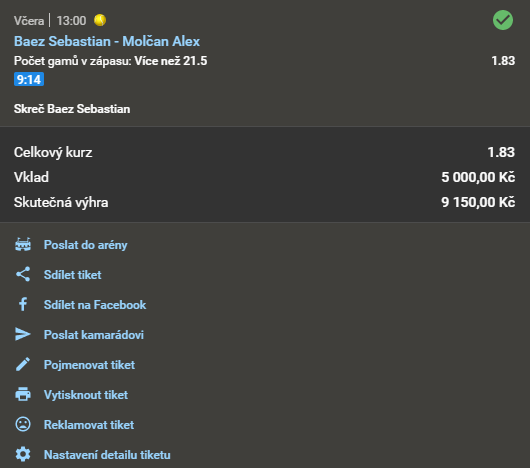 PREMIUM EXCLUSIVE TIP S VELICE VYSOKOU DŮVĚROU A NAŠÍM DOPORUČENÍM! = 98.5% DŮVĚRA! = Dle našeho názoru téměř výhra zdarma! = ABSOLUTNÍ POVINNOST VSADIT! 1.83 28. 4. 2021 14:00 Tenis, Baez - Molčan TIP: Počet gamů v zápasu: Více než 21,5 Zobrazit OK Zobrazit + 1 830 Kč