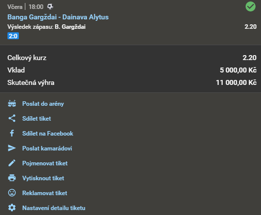 ABSOLUTNÍ MEGA "TUTOVKA"! = DLE NAŠEHO NÁZORU ABSOLUTNÍ POVINNOST VSADIT! = MEGA DOPORUČUJEME (DŮVĚRA 98.8%)! 2.21 13. 4. 2021 18:00 Banga Gargždai - Dainava Alytus TIP: 1 Zobrazit OK Zobrazit + 2 210 Kč