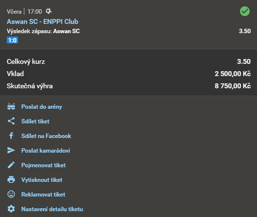 ODPOLEDNÍ MEGA KURZ (3.4+)!! = V PŘÍPADĚ ÚSPĚCHU POTENCIÁL OBROVSKÉHO ZHODNOCENÍ! = DOPORUČUJEME TĚM, KTEŘÍ SE NEBOJÍ TROCHU RISKOVAT! (95.5% DŮVĚRA)!! 3.51 6. 4. 2021 17:00 Aswan SC - ENPPI Club TIP: 1 Zobrazit OK Zobrazit + 3 510 Kč