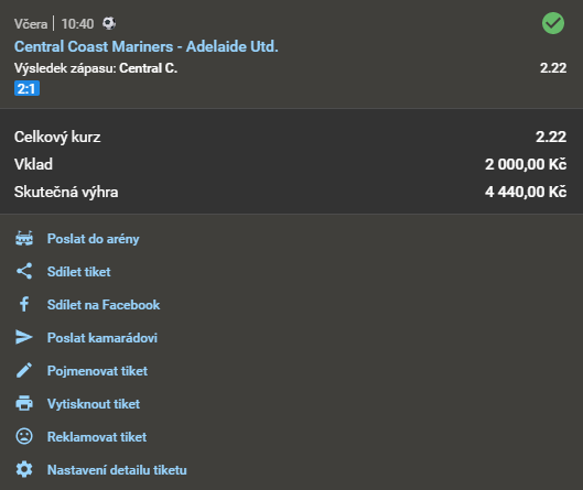 DOPOLEDNÍ SUPERLEVNÝ TIP! = DOPORUČUJEME PRO KLIENTY S RAZANTNĚ NIŽŠÍM KAPITÁLEM! = DLE NAŠEHO NÁZORU MÍRNĚ ZVÝŠENÉ RIZIKO!! 2.22 1. 4. 2021 10:20 Central Coast Mariners - Adelaide Utd. TIP: 1 Zobrazit OK Zobrazit + 2 220 Kč