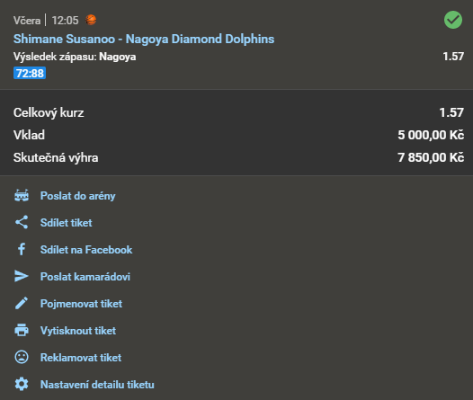 POLEDNÍ NAPROSTO EXKLUZIVNÍ PREMIUM TIP S EXTRÉMNĚ VYSOKOU DŮVĚROU (99.79%) = ABSOLUTNĚ DOPORUČUJEME! = JEDNA Z NEJVYŠŠÍCH DŮVĚR DNE! = EXTRÉMNĚ DOPORUČUJEME!! = SUPERTIP! 1.61 31. 3. 2021 12:05 Shimane Susanoo - Nagoya Diamond Dolphins TIP: 2 Zobrazit OK Zobrazit + 1 610 Kč