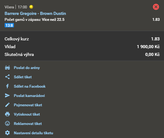 Tenis, Barrere - Brown D. 1.84 24. 3. 2021 17:00 Počet gamů v zápasu: Více než 22,5 Zobrazit KO Zobrazit 0 Kč