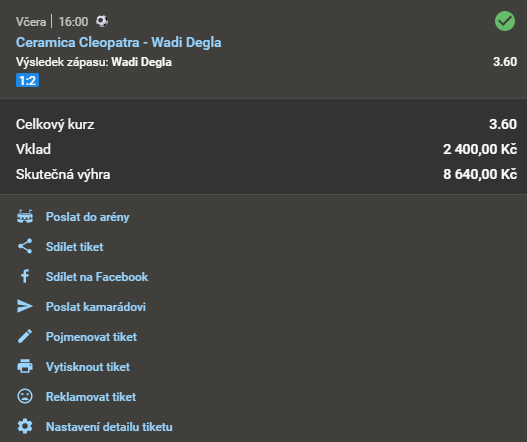 ODPOLEDNÍ MEGA KURZ (3.7+)!! = V PŘÍPADĚ ÚSPĚCHU POTENCIÁL OBROVSKÉHO ZHODNOCENÍ! = DOPORUČUJEME TĚM, KTEŘÍ SE NEBOJÍ TROCHU RISKOVAT! (95.5% DŮVĚRA)!! 3.72 16. 3. 2021 16:00 Ceramica Cleopatra - Wadi Degla TIP: 2 Zobrazit OK Zobrazit + 3 720 Kč