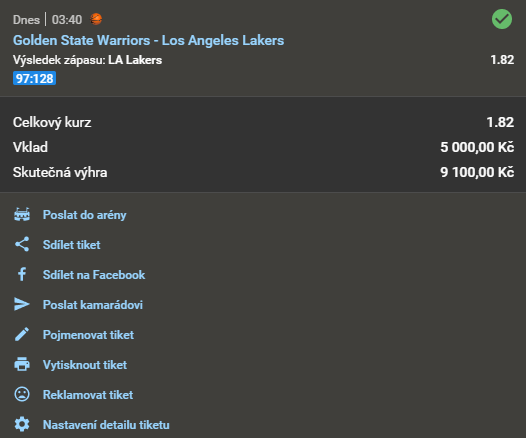 NOČNÍ MEGA TIP #3 = NAPROSTO EXKLUZIVNÍ NOČNÍ MEGA TIP S VELICE VYSOKOU DŮVĚROU (99.2%) = MEGA DOPORUČUJEME! 1.83 15. 3. 2021 23:59 Golden State Warriors - Los Angeles Lakers TIP: 2 Zobrazit OK Zobrazit + 1 830 Kč