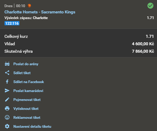 NOČNÍ MEGA TIP #1 = ABSOLUTNÍ SUPERTIP SE ZVÝŠENOU DŮVĚROU! = DOPORUČUJEME! (98.2% Důvěra) + SUPERTIP! 1.71 15. 3. 2021 23:59 Charlotte Hornets - Sacramento Kings TIP: 1 Zobrazit OK Zobrazit + 1 710 Kč