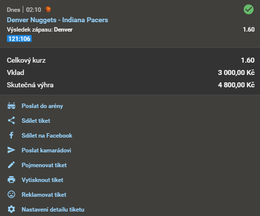 NOČNÍ MEGA TIP #4 = SKVĚLÝ POMĚR CENA / DŮVĚRA! = DOPORUČUJEME! = 97.2% DŮVĚRA! 1.67 15. 3. 2021 23:59 Denver Nuggets - Indiana Pacers TIP: 1 Zobrazit OK Zobrazit + 1 670 Kč