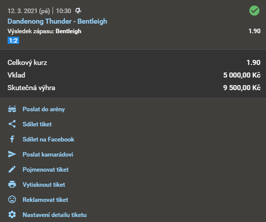 RANNÍ NAPROSTO EXKLUZIVNÍ MEGA "TUTOVKA"! = DLE NAŠEHO NÁZORU ABSOLUTNÍ POVINNOST VSADIT! = EXTRÉMNĚ DOPORUČUJEME! => DŮVĚRA 99.2%! 1.91 12. 3. 2021 10:30 Dandenong Thunder - Bentleigh TIP: 2 Zobrazit OK Zobrazit + 1 910 Kč