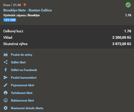 NOČNÍ MEGA TIP #2 = SUPERLEVNÝ NOČNÍ MEGA TIP! = IDEÁLNÍ PRO KLIENTY S VELICE MALÝM KAPITÁLEM! = Doporučujeme vsadit za SNÍŽENÝ vklad! 1.76 11. 3. 2021 23:59 Brooklyn Nets - Boston Celtics TIP: 1 Zobrazit OK Zobrazit + 1 760 Kč