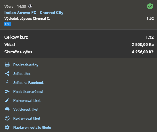 ODPOLEDNÍ SUPERTIP! = 96.4% DŮVĚRA! 1.61 11. 3. 2021 14:30 Indian Arrows FC - Chennai City TIP: 2 Zobrazit OK Zobrazit + 1 610 Kč