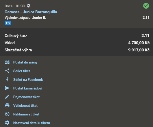 NOČNÍ MEGA TIP = ABSOLUTNÍ SUPERTIP SE ZVÝŠENOU DŮVĚROU! = DOPORUČUJEME! (98.2% Důvěra) + SUPERTIP! 2.11 10. 3. 2021 23:59 Caracas - Junior Barranquilla TIP: 2 Zobrazit OK Zobrazit + 2 110 Kč