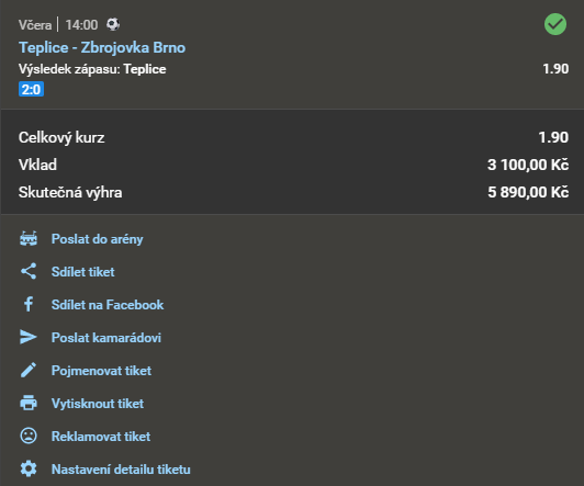ODPOLEDNÍ SUPERTIP S DŮVĚROU 96%! = ZAJÍMAVÝ TIP! 1.90 3. 3. 2021 14:00 Teplice - Zbrojovka Brno TIP: 1 Zobrazit OK Zobrazit + 1 900 Kč
