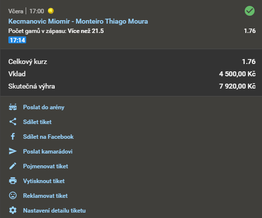PREMIUM EXCLUSIVE TIP S VELICE VYSOKOU DŮVĚROU A NAŠÍM DOPORUČENÍM! = 98.5% DŮVĚRA! = Dle našeho názoru téměř výhra zdarma! = ABSOLUTNÍ POVINNOST VSADIT!! 1.76 3. 3. 2021 17:00 Tenis, Kecmanovic - Monteiro TIP: Počet gamů v zápasu: Více než 21,5 Zobrazit OK Zobrazit + 1 760 Kč