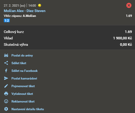Tenis, Molčan - Diez 1.74 27. 2. 2021 14:30 Molčan Zobrazit KO Zobrazit 0 Kč